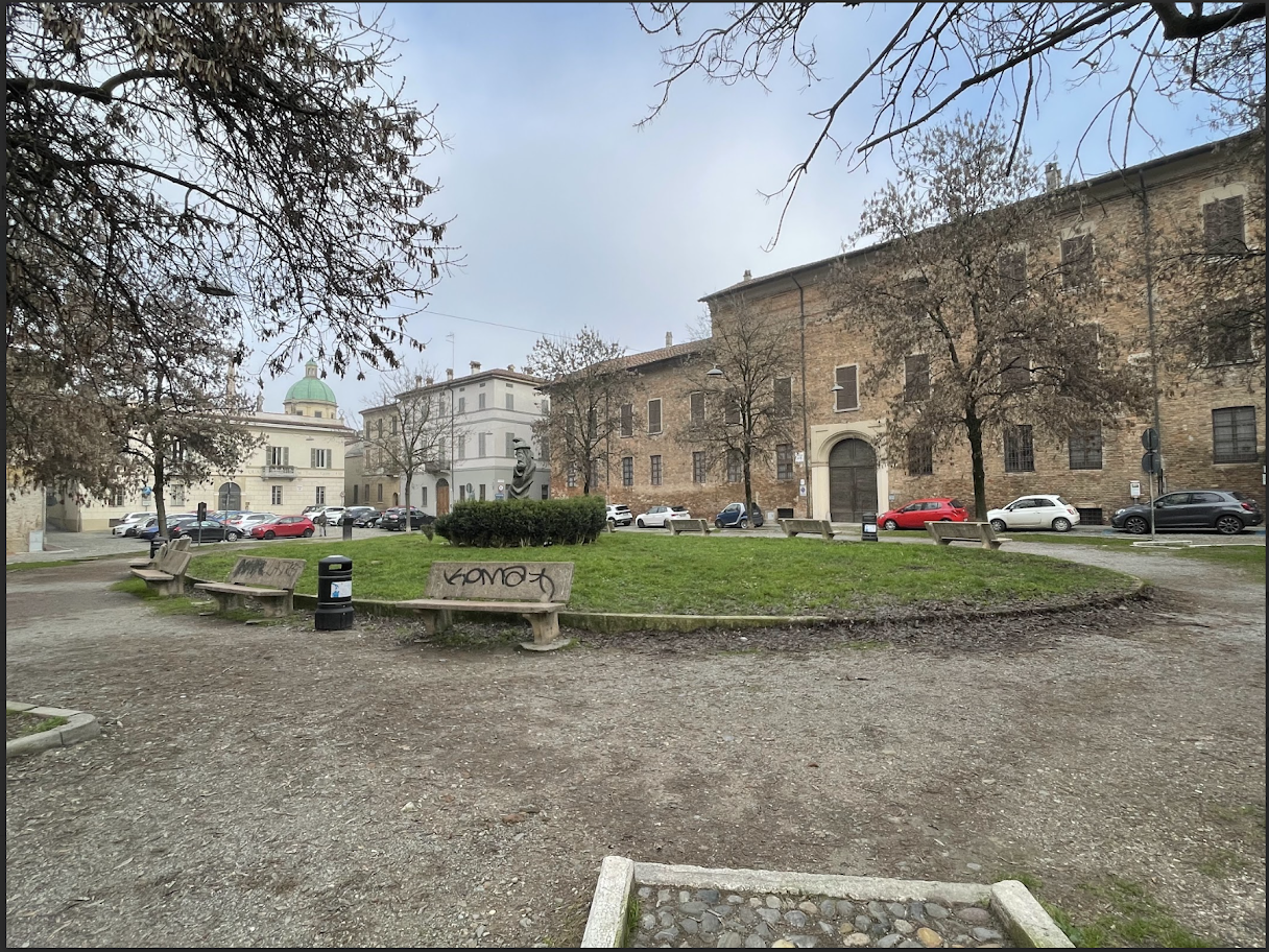 piazzetta con 8 entrate, con una grossissima aiuola posta al centro; è presente una statua in centro che non si nota perchè coperta da piante, le panchine tenute male così come i cestini. Le aiuole degli alberi sono troppo basse, le centraline elettriche sono scoperte, i lampioni non funzionanti e il terreno e maltenuto.